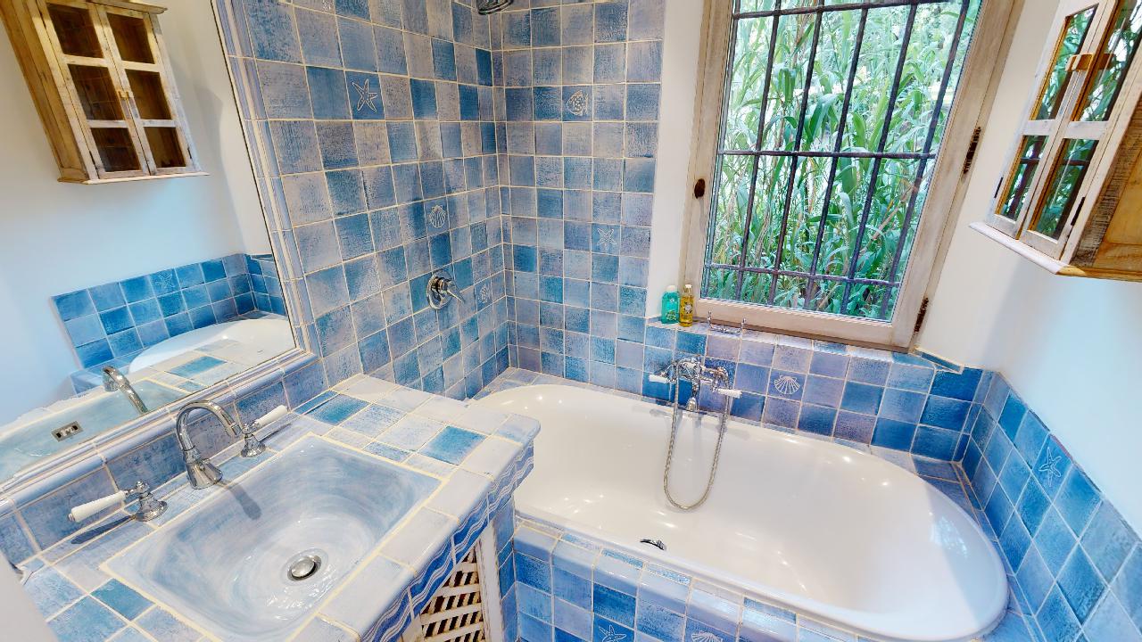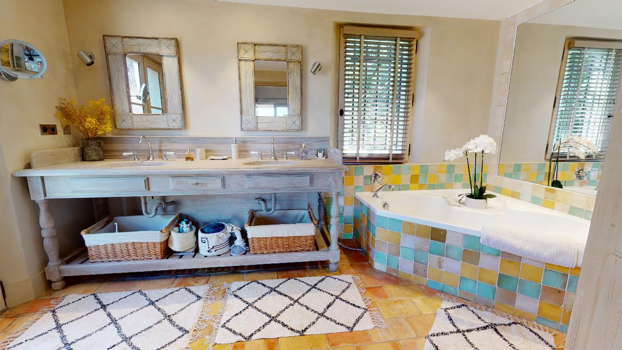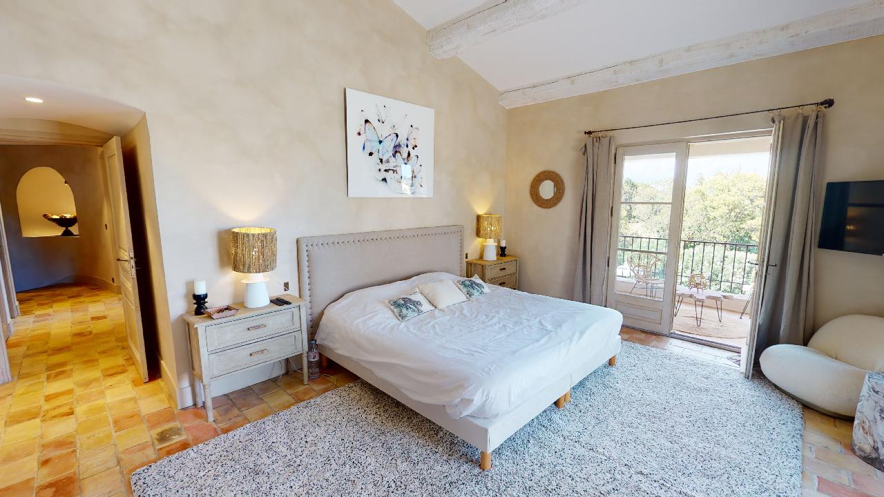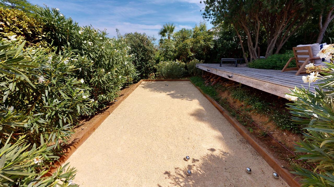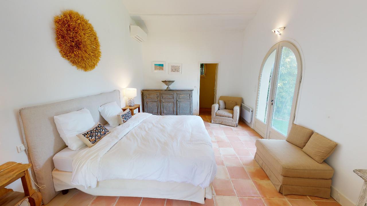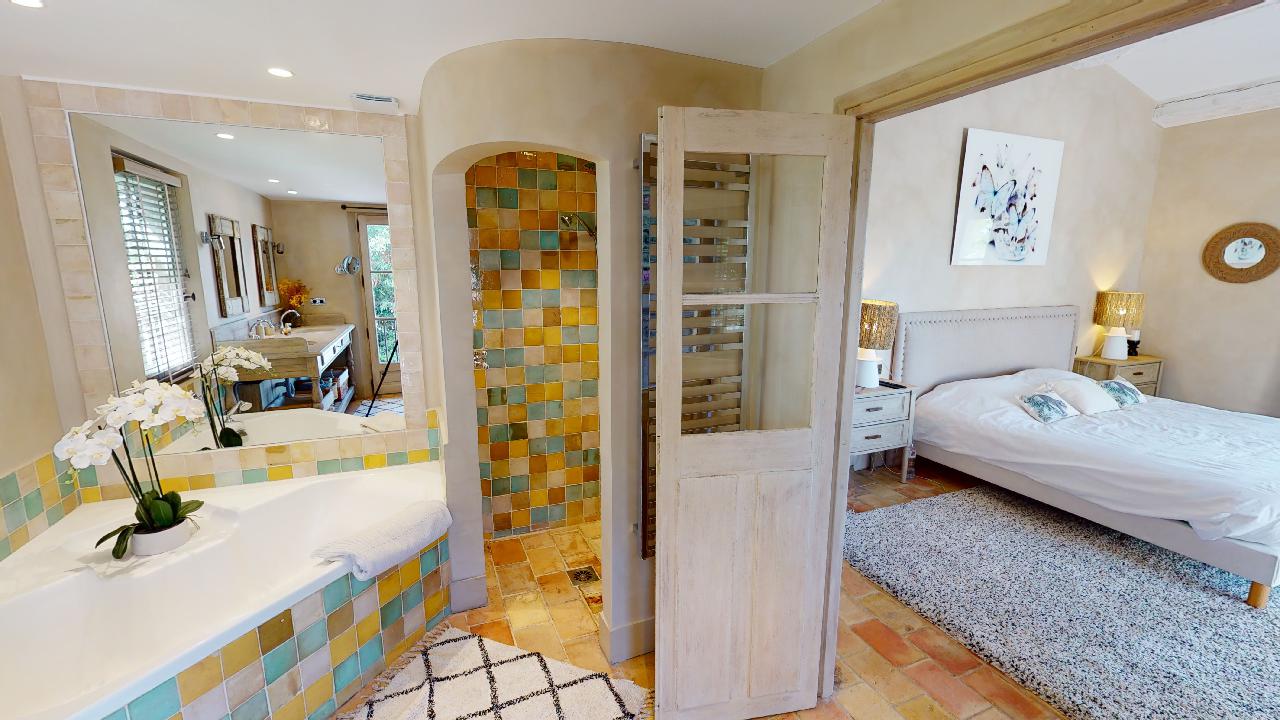 • Large Master bedroom (2×2) opening on a terrace facing the baie des Canoubiers with its bathroom (shower+bathtub)