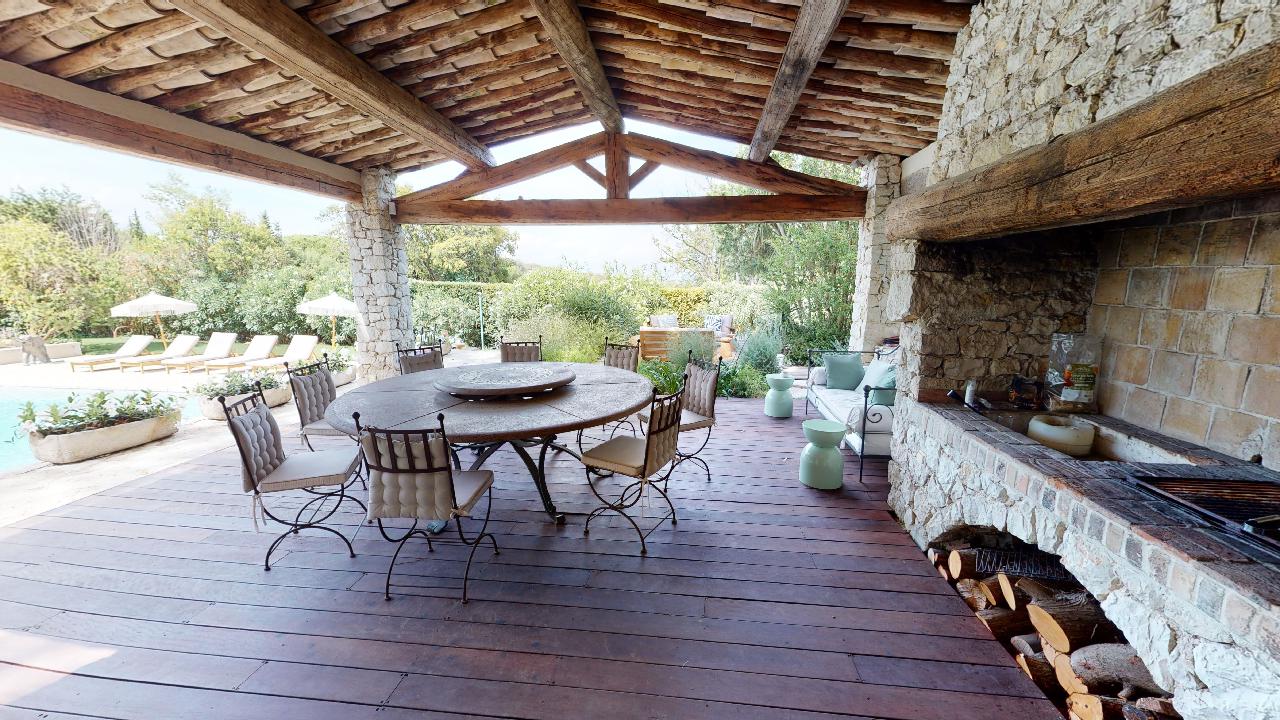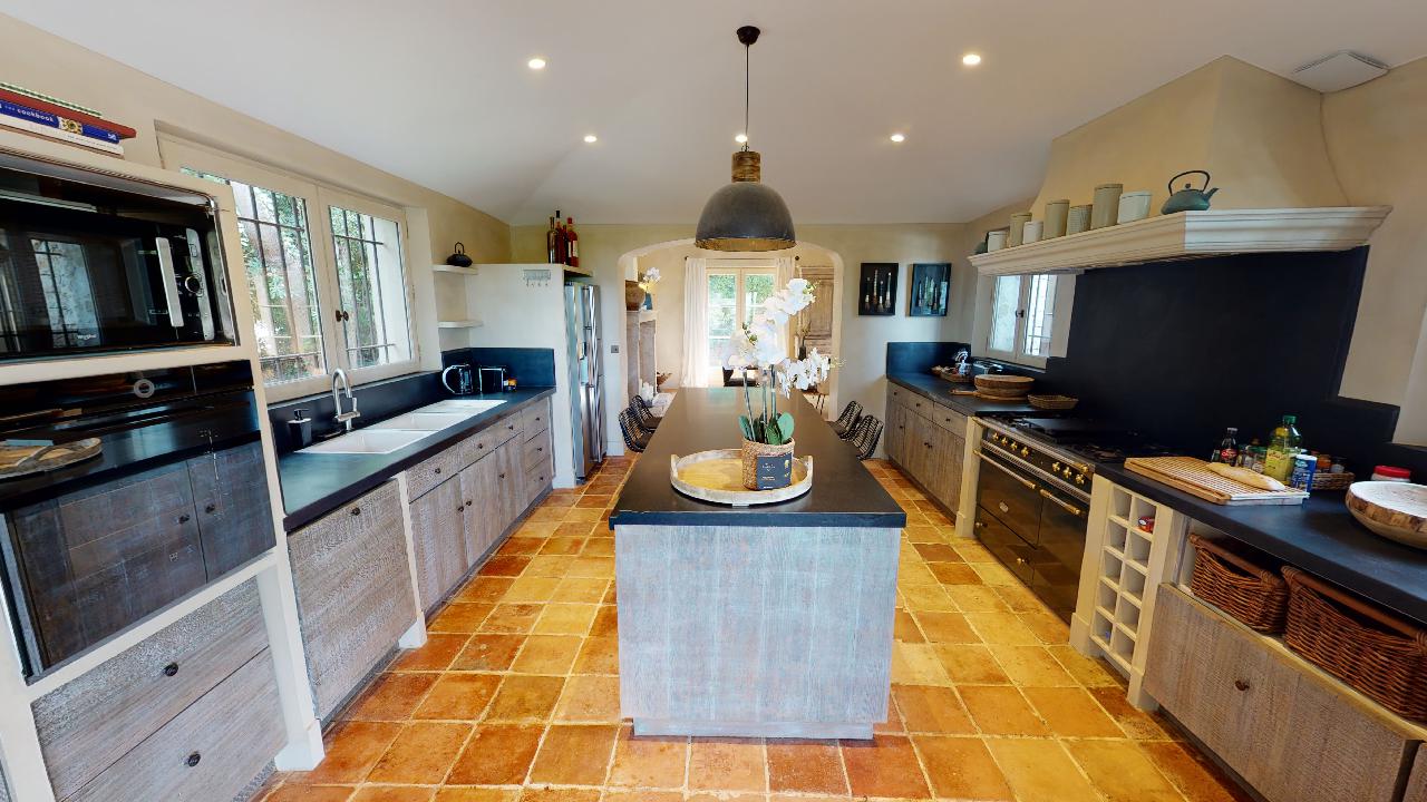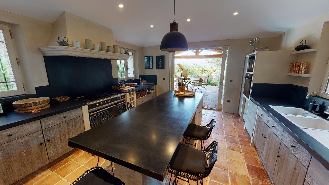 • large kitchen opening on a covered terrace with dining area