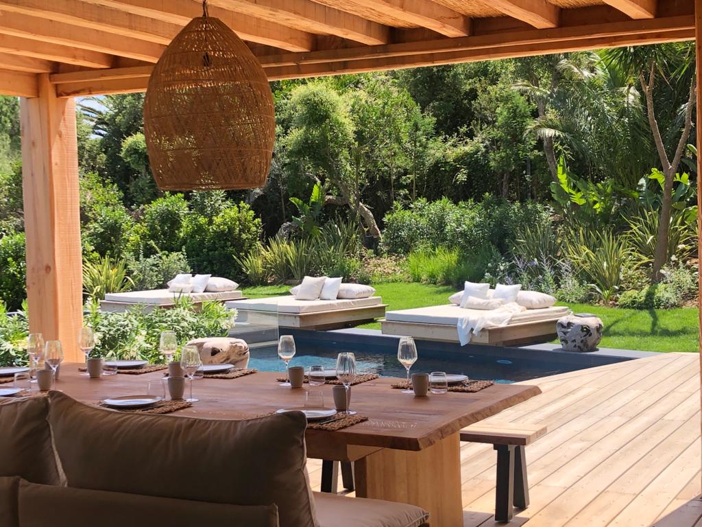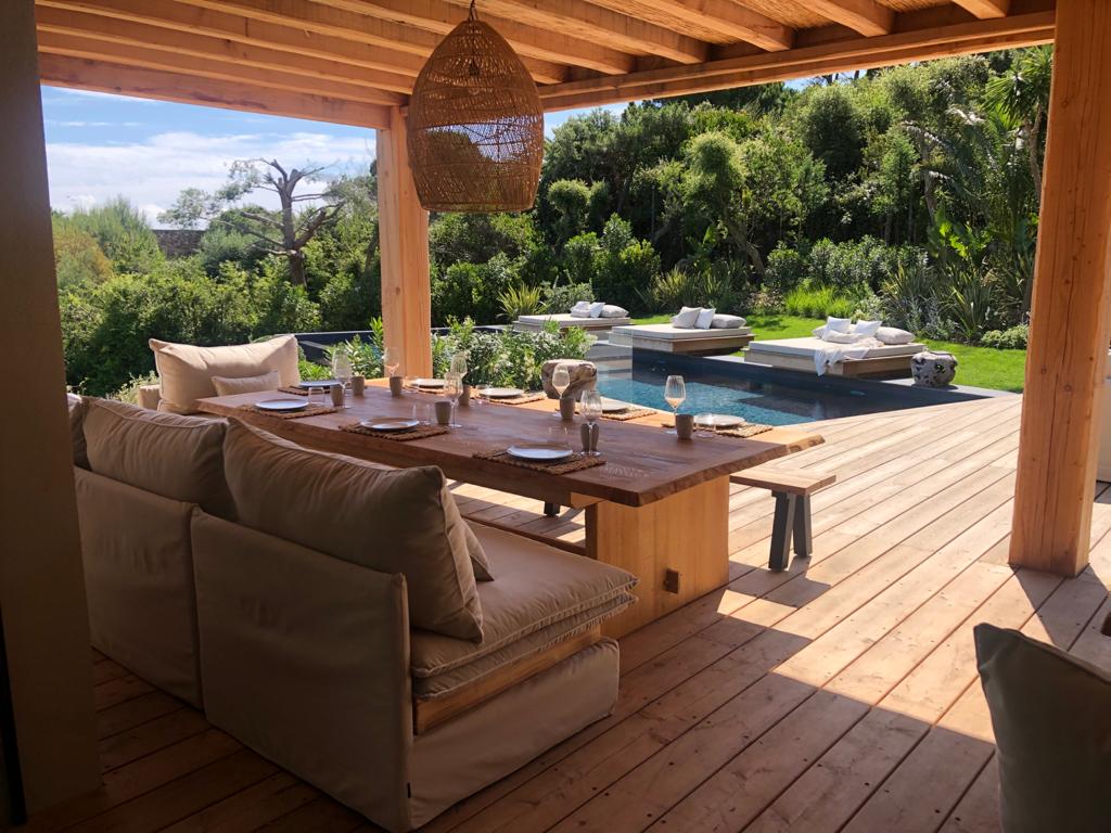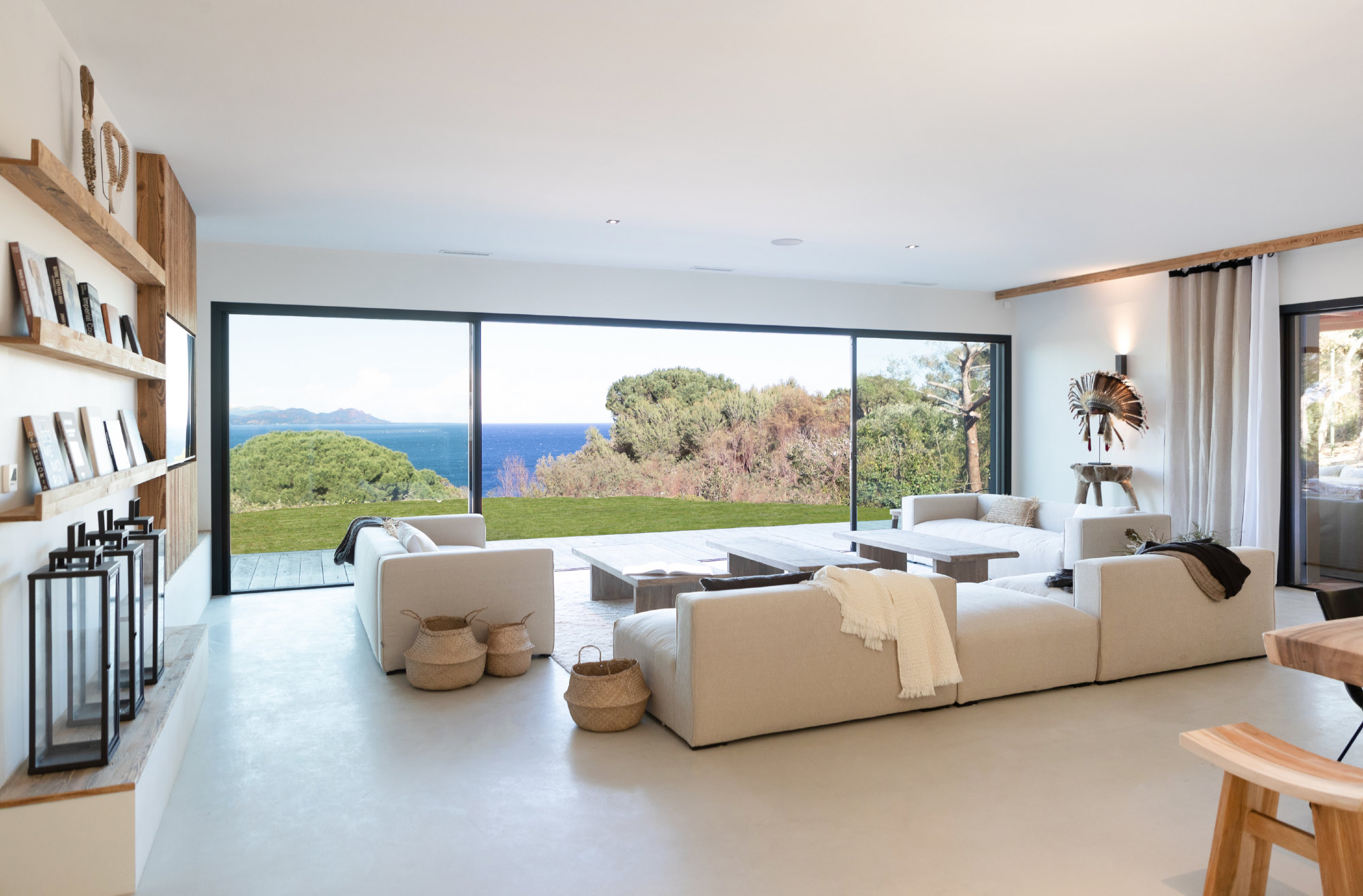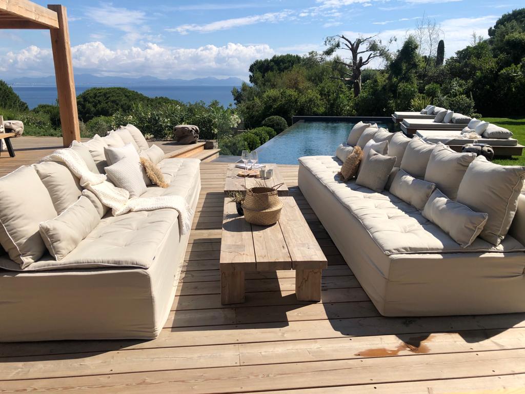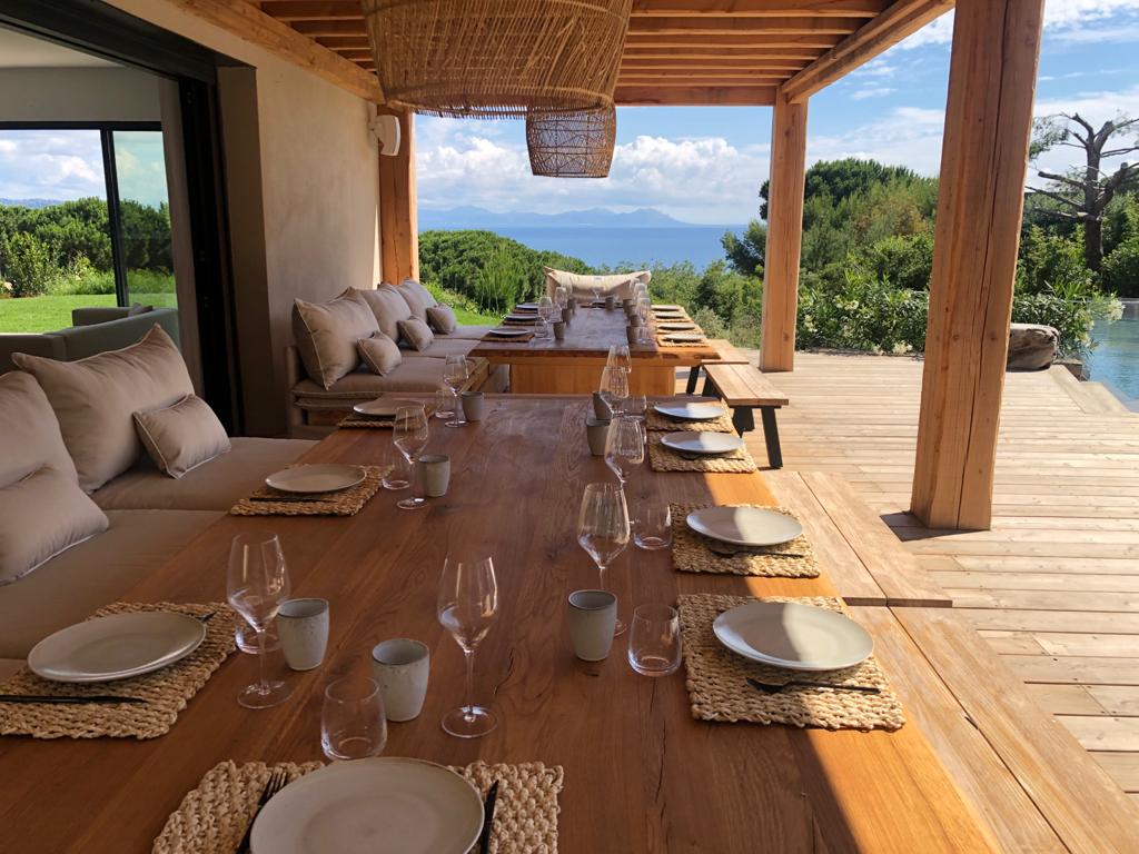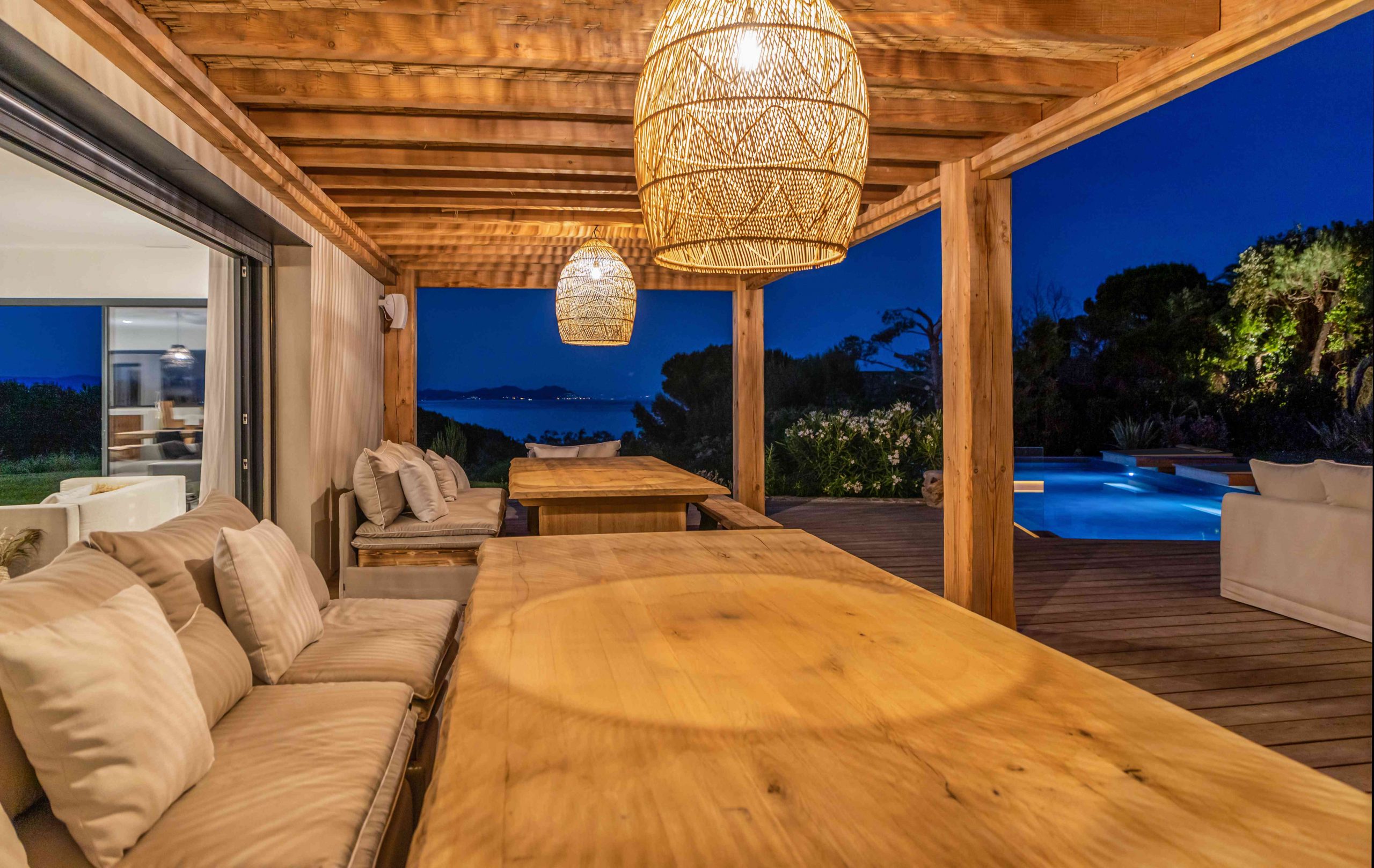 - Large living room and dining room (110 m2) opening on terraces facing the sea on one side and the swimming pool on another