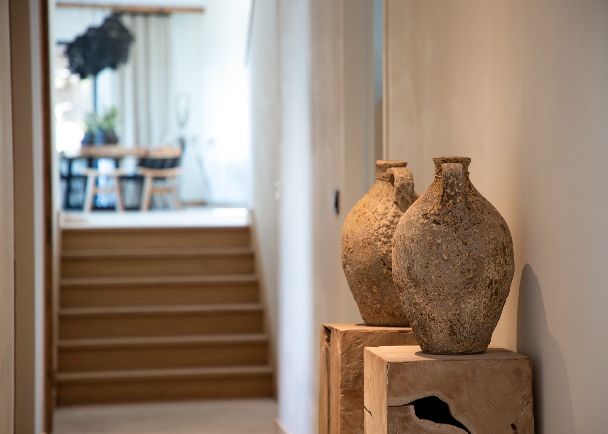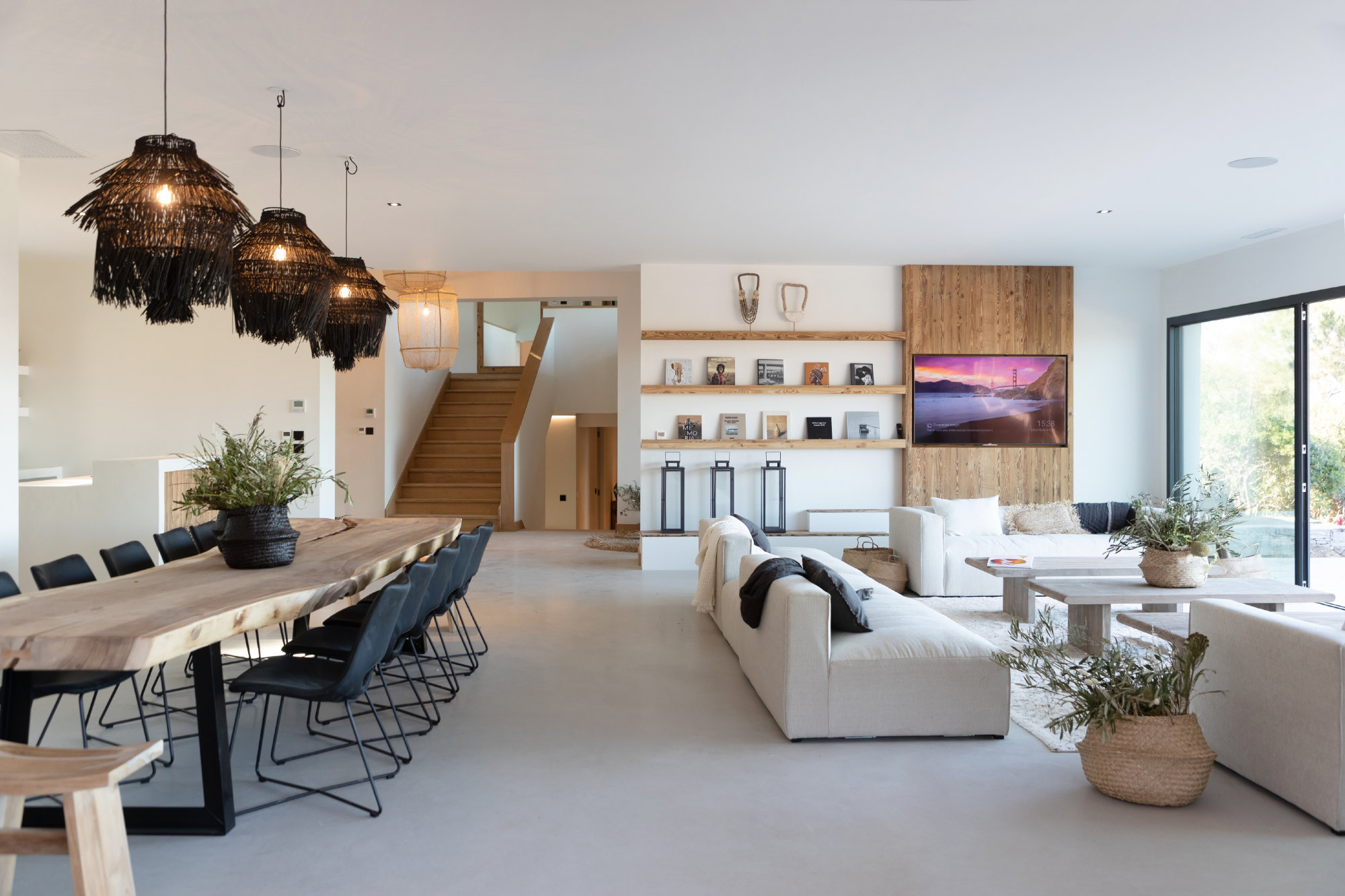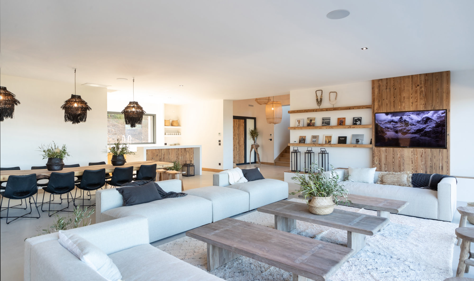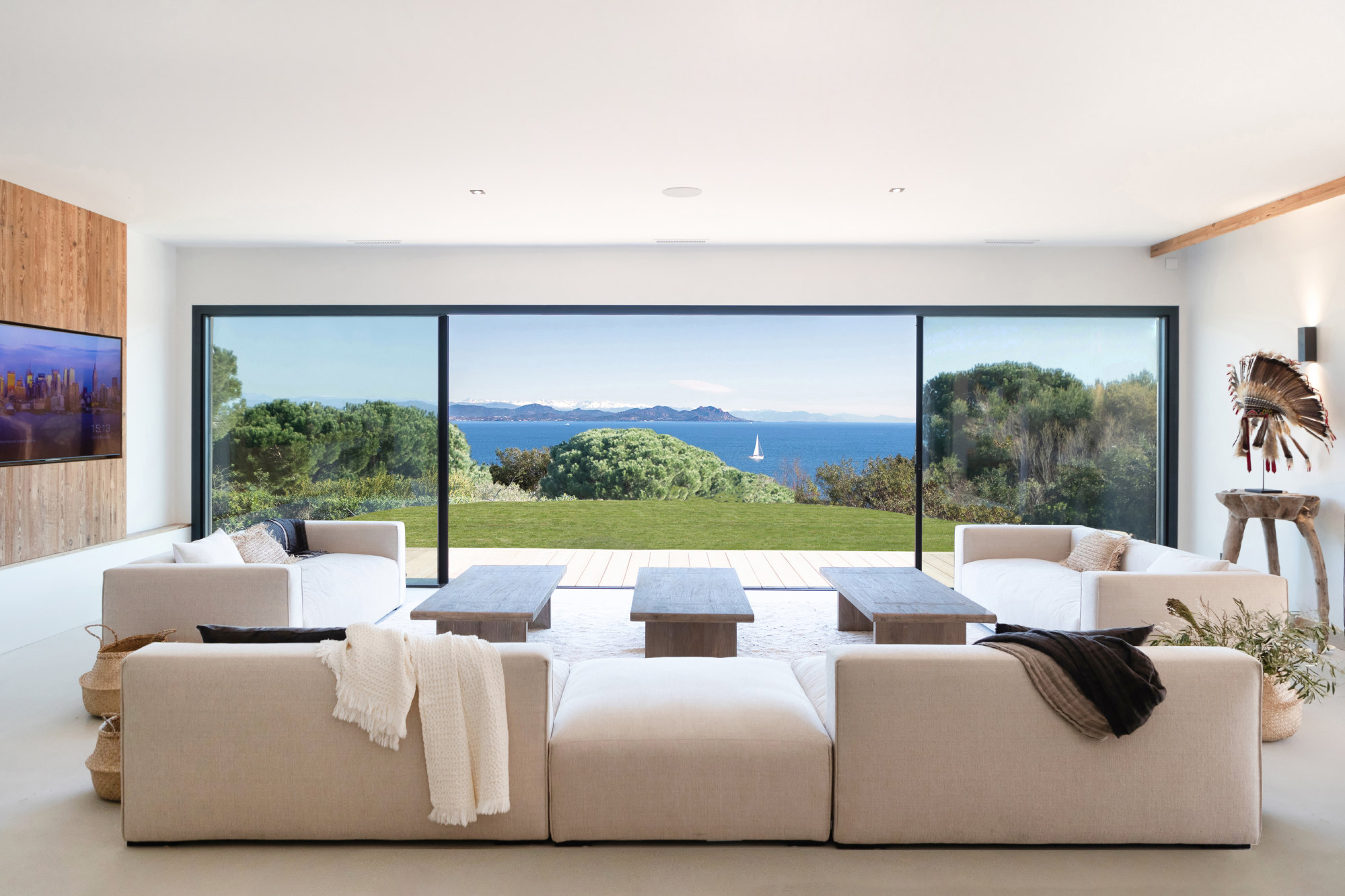 - Large living room and dining room (110 m2) opening on terraces facing the sea on one side and the swimming pool on another